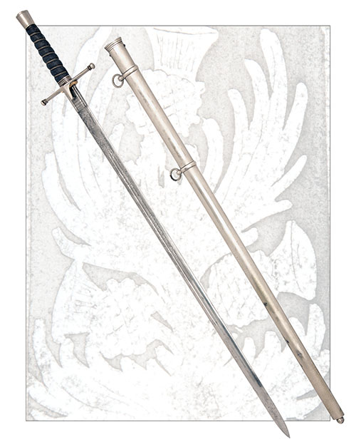 from the reign of Edward VII, with straight double edged 32 3/4in. blade etched with floral scrolls within arabesque panels, the 'HLI' monogram, the light infantry bugle, the crest of 'ERVII' and Scottish patriotic thistles, twin narrow central blind fullers, the forte etched with 'LECKIE, GRAHAM & CO RENFEILD ST GLASGOW', the reverse with an inlet proofmark within an etched 'Star of David', straight cross-guard with narrow langets and ball quillions, wire-bound fishskin grip-piece and reverse tapering pommel with carved Scottish cross to the top, complete with its plated scabbard with ball tip