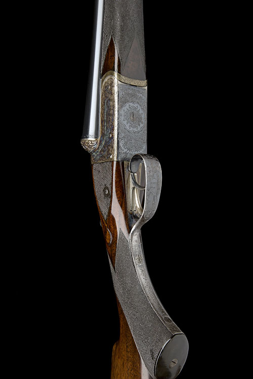 27in. nitro barrels, the rib engraved 'WESTLEY RICHARDS. 23 CONDUIT ST. LONDON. GUN MAKERS BY APPOINTMENT TO HM THE KING', and gold-inlaid at the breech end '2 INCH CARTRIDGES. 12. 1.', 2in. chambers, bored approx. 3/4 and full choke, treble-grip action, Westley Richards patent toplever gold-inlaid with an Indian crown, manual side safety with gold-inlaid 'SAFE' detail, the fences deeply carved in high relief with scrolling floral and acanthus designs on a finely matted background, fine acanthus scroll engraving, the triggerguard with a pointer on point, retaining much original colour-hardening and finish, 15 1/8in. figured pistolgrip stock with horn pistolgrip-cap, wooden insert at comb and 7/8in. wooden extension, fore-end with Deeley & Edge patent release catch and horn finial, weight 5lb. 7oz., in a lightweight leather case