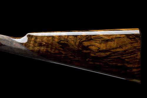 28in. nitro chopperlump barrels, , the tubes engraved 'HOLLAND & HOLLAND BRUTON STREET, LONDON.', and with a band of bold foliform engraving at the breech end, 2 3/4in. chambers, bored approx. 1/4 and 3/4 choke, automatic safety, hand-detachable lockplates, finely matted gold-inlaid cocking-indicators, rolled-edge triggerguard, the action, lockplates and furniture deeply carved with flowing acanthus with foliform bordering, all on a dark, finely matted background, the triggerplate signed 'R. BAPTISTE', the fore-end engraved en suite, 15 1/2in. highly-figured stock with diamond grip, weight 7lb. 6oz., in its lightweight leather case