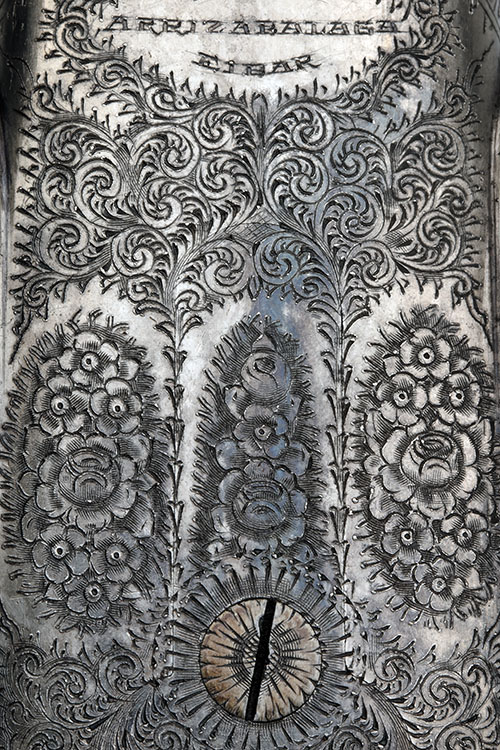 26 3/4in. nitro chopperlump barrels, raised file cut ribs gold-inlaid '1' and '2' at the breech ends, tubes engraved 'PEDRO ARRIZABALAGA. EIBAR. ACERO CROMO NIQUEL', 2 3/4in. chambers, bored approx. true cyl. and 1/4 choke (No.1) and 1/4 and 1/2 choke (No.2), No.2 left wall thickness at 19, treble-grip actions with hidden third bites and side-clips, removable striker discs, toplevers gold-inlaid '1' and '2', automatic safeties, Holland & Holland style self-opening systems, hand-detachable lockplates, cocking-indicators, articulated front triggers (set for the left hand), floral and acanthus scroll engraving, retaining very slight traces of original colour-hardening, 14 3/4in. figured stocks (cast on for the left shoulder) including 3/4in. rubber recoil pads, small knot split No.1, slight setting cracks to rear of top tangs, weight 6lb. 6oz. (No.1) and 6lb. 2oz. (No.2)