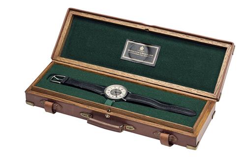 for 1995, with certified chronometer 21 jewel automatic movement, monometallic balance wheel, duotone silvered dial with black Roman numerals, applied dot hour and minute markers, blacked Breguet hour and minute hands with a baton second hand running on a central inner track with Arabic numerals, plain circular 35mm stainless-steel case with hinged engraved back opening to reveal a further crystal back showing the movement, onion winder at '3', dial and movement signed, complete with its oak and leather presentation case styled as a shotgun case with 'C.O.S.C.' certificate and instructions