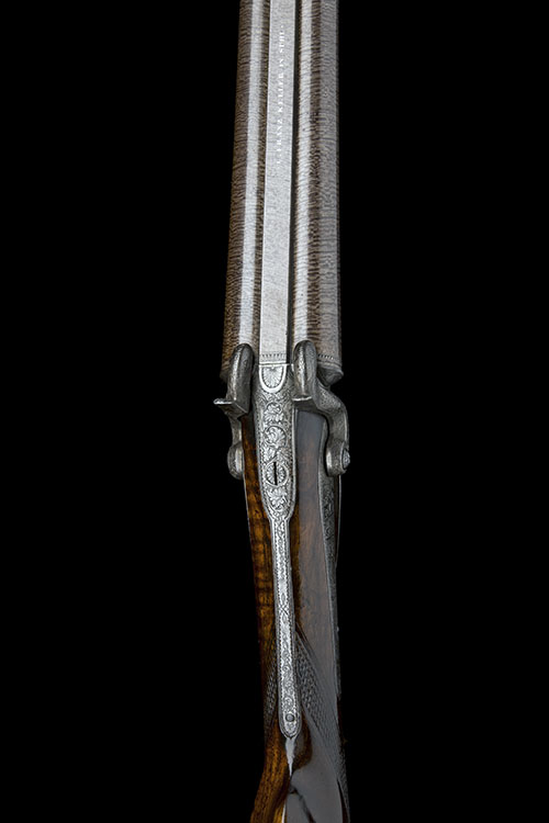 circa 1860, with fine twist re-browned 28 3/4in. barrels, the plain top-rib signed in silver 'C. FRANZ KELLER IN SUHL', dove-tailed blade fore-sight, folding leaf rear-sight, engraved band at breech, borderline and scroll engraved long top-tang, fully floral, border and gamescene engraved back-action locks, engraved dolphin hammers, chequered walnut butt-stock with raised cheek-piece, iron heel-plate, moulded horn lower tang cover, carved and engraved trigger-guard bow, single set trigger for the rifle-barrel, engraved rounded action, chequered walnut splinter fore-end and engraved Lefaucheux swing under-lever