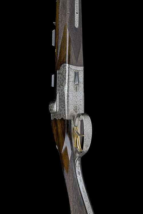 24 1/2in. nitro barrels, over barrel engraved 'MANUFACTURE D'ARMES DE LUXE MASQUELIER LIEGE', matt sight rib with open sights and folding leaf sight and with telescopic sight mount bases, ramp-mounted bead fore-sight, three-piece fore-end with wooden side fillets, quadruple-grip scroll-back action with short side bolsters, one removable striker disc, manual safety, gold-washed triggers, the front articulated, full engraved with acanthus scrollwork, the triggerplate initialled 'R.C.', bright finish, 14 3/4in. figured roachbelly stock, weight 7lb. 12oz., in its lightweight leather case