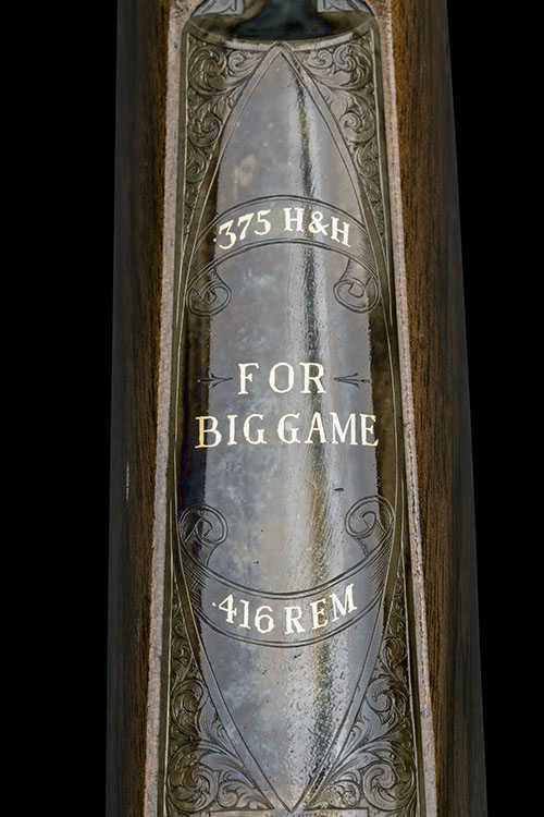 24in. nitro .416 Rem. barrel gold-inlaid 'Ray Ward' in script and engraved '(GUNSMITH) LONDON', the knox form with a scrolling banner gold-inlaid with the calibre designation and serial number 41641, block-mounted open sights and ramp-mounted bead fore-sight;