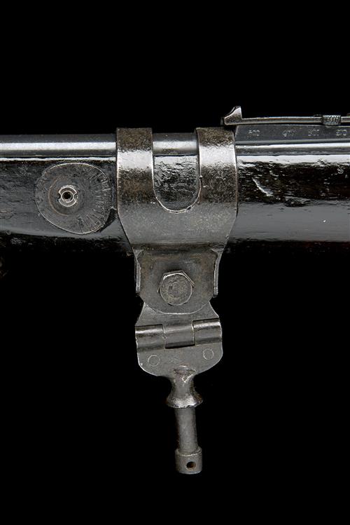 30 1/8in. nitro barrel, ramp-mounted fore-sight, folding ladder rear-sight, volley-sights (the forepart missing), dust cover, manual safety, magazine cut-off, action marked with 'V.R.' cypher, dated 1896, 'L.E. I' detachable box magazine, mounted with a pintle mount, possibly shortened and modified for aircraft use