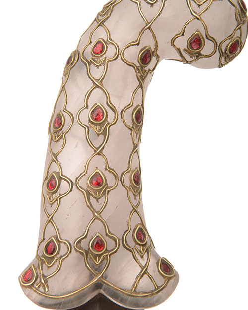 mid 19th century, the 10in. recurving watered blade carved with a central spine and raised polished cutting edges, the translucent nephrite hilt of classic 'Mughal' pistol-grip form and decorated with applied yellow metal wire decoration interspersed with cabochon rubies, no scabbard