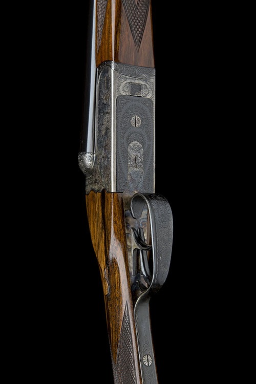 27in. nitro chopperlump barrels, 2 3/4in. chambers, bored approx. imp. cyl. and 1/4 choke, scroll-back action with removable striker discs, automatic safety, articulated front trigger, rolled-edge triggerguard, acanthus scroll engraving with floral bouquets, retaining much original colour-hardening and finish, 14 3/8in. figured stock including chequered buttplate, weight 5lb. 8oz.