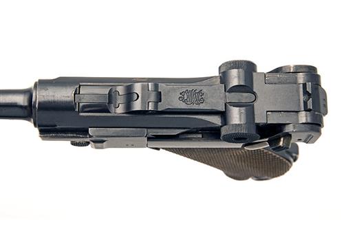 the pistol originally circa 1915, with replacement Swiss 4 5/8in. barrel, blued receiver with 'DWM' toggle, blued frame, 'straw' coloured ancillaries, stockboard lug to heel, and un-numbered wood based magazine, all matching numbers except the sideplate (numbered '58')