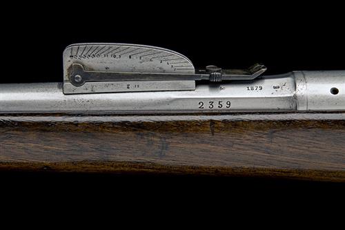 converted in 1890 from an M1871 Beaumont rifle dated '1879', with 32 1/2in. barrel, block and blade fore-sight, elevating rear-sight, round receiver with large bolt-handle (bolt and receiver numbered '642'), fixed Vitali magazine, walnut full-stock, iron furniture and under-barrel clearing rod, the whole brushed bright except magazine
