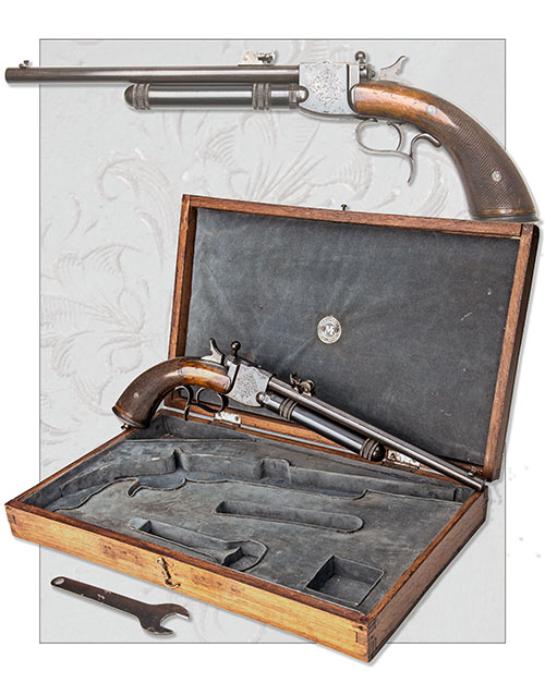 circa 1895, with round, blued, 11in. barrel signed by the maker, dove-tailed blade fore-sight, elevating tangent rear-sight, blued, scroll engraved slab-sided receiver with rotating loading tap for ball and external hammer, detachable reservoir under the barrel (numbered 3787), chequered walnut grips with domed iron pommel with central finial, spurred triger-guard and adjustable trigger, complete with a slightly later 'Manufrance' wood case lined out in the continental fashion for this pistol together with a reservoir spanner