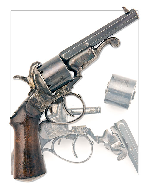 circa 1865, with blued octagonal 4in. barrel, dove-tailed bead fore-sight, sighting notch to hammer nose, swing under-lever break open design featuring a split cylinder arbor clamp, the underside of hinged signed 'JAVELLE M. ST. ETIENNE' in a crescent over 'BTE S.G.D.G.', plain blued cylinder locking on the hand, oversize pin shield, exposed hammer, guarded trigger (some pitting to guard) and smooth semi saw-back walnut grip with domed iron butt-cap, strong amount of finish remaining to barrel, remainder discoloured