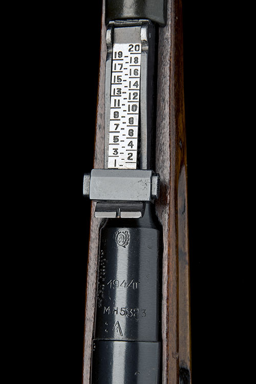 29in. nitro blued barrel, blade fore-sight with ring protector, elevating tangent rear-sight, blued receiver dated 1944 with 'MH5323', fitted with a P3U 'WZR-58' telescopic sight and mount, A-8842B, bright turned-down bolt with matching serial number, fitted cleaning rod, hinged floorplate, with matching serial number, full-length stock, steel buttplate with matching serial number