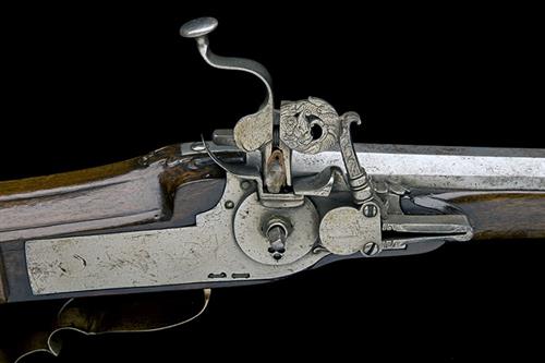 German circa 1680, with slightly swamped octagonal 30 1/2in. barrel (cleaned), dove-tailed fore-sight, standing notch rear-sight with additional folding blade, heavily cleaned lock (traces of engraving) with internal wheel, carved and shaped hammer with serpentine cocking piece and engraved detail inhabited by a mythical beast, walnut full-stock with angled butt, sliding patch-box lid of wood with metal inlay, horn heel-plate with iron shoulder-button, carved cheekpiece (circular central escutcheon absent), complex pierced brass sideplate with central vacant shield escutcheon, brass trigger-guard bow with shaped finger-grooves, double set triggers (hogs-bristle trigger blade incomplete), shaped and turned faceted ramrod pipes and replacement ramrod