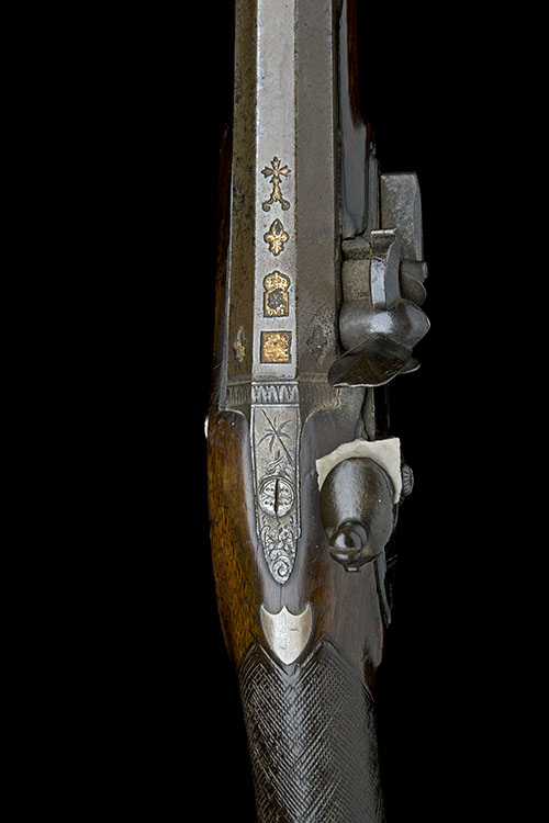 circa 1795, with two stage 28in. Spanish barrel banded and engraved at the intersection with traces of gilt inlay, bead fore-sight, gilded Spanish makers cartouches and fleur-de-lys quality marks at breech, slightly curved, flat, bevel-edged stepped tail lockplate signed forwards of the hammer in script 'H.W. MORTIMER & CO', gilded rainproof pan, roller frizzen, walnut half-stock chequered at the wrist (crack below the lock), raised cheek-piece, iron furniture including scrolled pistol-grip lower tang, vase finial, horn fore-end tip and replacement ramrod