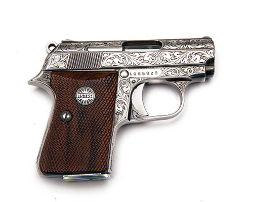circa 1965, with 2in. barrel, fully scroll engraved and silver-plated slide, silver plated and engraved frame, chequered walnut grips inlet with 'ASTRA' medallions, external hammer and complete with its green leatherette manufacturer's presentation case lined with green satin to take the pistol and a spare magazine (included), together with its original handbook