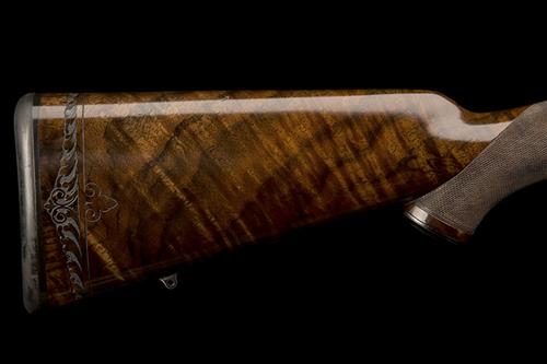 23in. nitro barrel engraved in gothic script 'J. RIGBY & CO., LONDON, ENGLAND', short file cut sight rib with open sights and one folding leaf sight, matted finish with gold-inlaid sight lines and marked for 100 and 200 yards, block-mounted bead fore-sight with flip-up moonsight, the receiver (with thumb cutout and Mauser Oberndorf details) mounted with a Zeiss Victory HT 2,5-10x50 telescopic sight, serial no. 4354700, in quickly-detachable mounts, the rings with fine acanthus scroll engraving and the makers name and calibre designation, the receiver ring engraved 'RIGBY'S .375 H&H MAGNUM', bolt knob with chequered oval panels, recoil blocks, hinged straddle floorplate with push button release and engraved 'RIGBY CAL. .375 H&H' in a roundel, highly-figured pistolgrip stock with cheekpiece, carved art nouveau band to the rear, steel pistolgrip-cap (with trap), horn finial, sling eyes, 14 1/8in. pull including 1/2in. rubber recoil pad, weight 8lb. 5oz. (unscoped) and 9lb. 14oz. (with scope)
