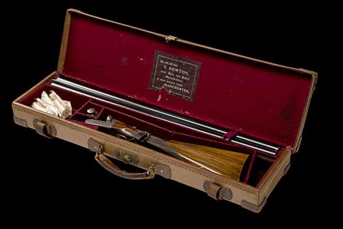 28in. nitro barrels, rib engraved 'T. NEWTON. 48 KING STREET WEST. MANCHESTER', 2 1/2in. chambers, bored approx. imp. cyl. and 1/2 choke, treble-grip action, automatic safety with white metal inlaid 'SAFE' detail, bold acanthus scroll engraving with beaded bordering, the underside with a floral bouquet, retaining some original colour-hardening and finish, 14in. figured stock with diamond grip, weight 6lb. 2oz., in its lightweight leather case with T. Newton trade label and T. Newton nickel plated oil bottle