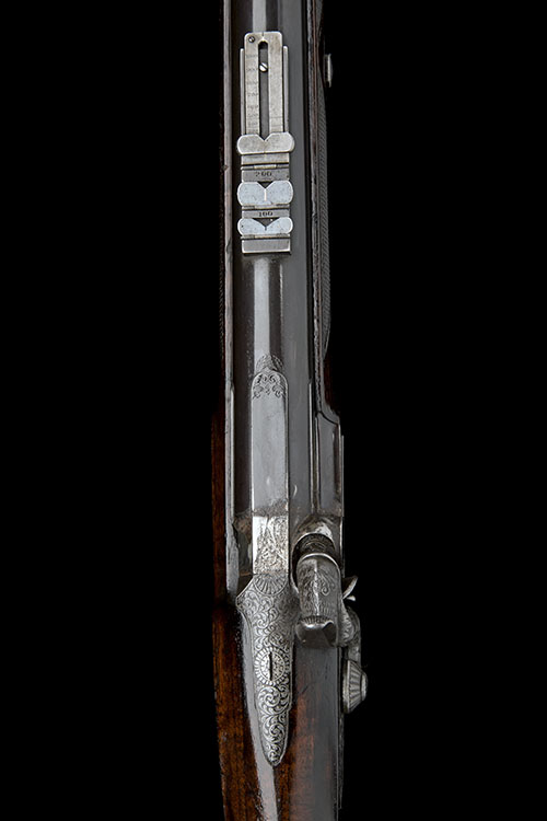 circa 1860, with heavy round 30in. barrel deeply crowned at the muzzle, the top signed forwards of the ladder rearsight with two additional folding leaves 'WHITWORTH PATENT', patent breech with short sighting rib scroll engraved at the tip, fully scroll engraved top tang (traces of colour), border and scroll engraved bar-action lock signed 'WHITWORTH', sliding safe forwards of the fully scroll engraved dolphin headed hammer, the engraving further enhanced with depictions of birds and serpents, figured chequered walnut half-stock with scroll engraved iron patch-box and heel-plate, the lower tang with raised chequered pistol-grip spur, rounded horn fore-end tip and no provision for ramrod