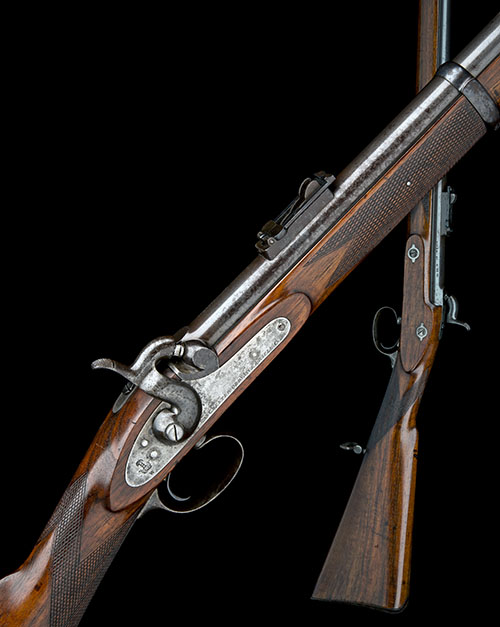 possibly for volunteers or trials, with 39in. Whitworth rifled barrel, block and blade fore-sight, elevating ladder rear-sight, the top of breech signed 'WHITWORTH PATENT', commercial proofs, plain lock signed 'MANCHESTER ORDNANCE & RIFLE CO.',with the Whitworth 'wheatsheaf' trademark to the tail, chequered walnut three-quarter stock with iron furniture including variant trigger guard, heel-plate and three barrel-bands, iron ramrod with 'cotton-reel' tip, much original blued finish with traces of colour