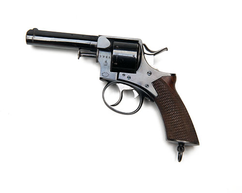 circa 1880, with blued ovoid 4 1/2in. barrel (marked around fore-sight), sighting groove to top-strap, flush fitting ejector crane around barrel, blued stepped frame marked 'WEBLEY'S PATENT', plain blued six-shot cylinder with front locking notches, brushed bright hammer and trigger, chequered walnut semi saw-handled one-piece grip, lanyard ring at pommel and guarded trigger, the whole retaining virtually all its factory bued finish except where noted and complete with an unlabelled English market oak storage case compartmented and lined in blue baize with provision for ammunition and including a turn-screw, oil-bottle and cleaning rod