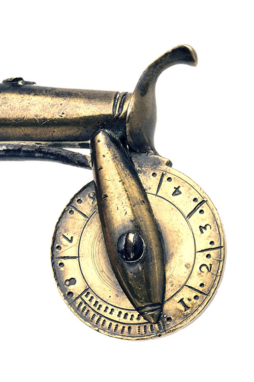 circa 1760, with tapering borderline engraved brass body with small diameter internal powder chamber, spurred and hinged muzzle-cover operating on an under-slung wheeled scale with under-body tension spring, walnut butt with swollen bag-shaped grip and top-mounted priming well