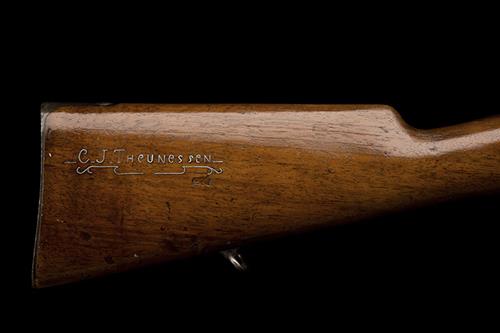 circa 1897, with blued 30in. barrel, block and dove-tailed blade fore-sight, elevating ladder rear-sight, blued receiver with brushed bright turned down bolt, squared and chequered safety, walnut three-quarter straight hand stock, the first half of the barrel with walnut handguard, the right hand side of butt with rare inlay of silver wire reading 'C. J. THEUNESSEN', blued iron furniture, bayonet lug to nose-cap and fitted with sling swivels, together with three volumes 'Carvings From The Veldt', volumes 1,2, & 3 by Dave C George.