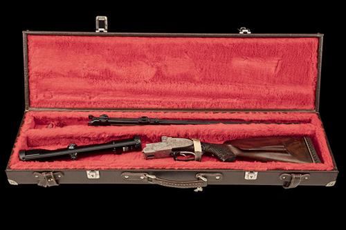 24 3/8in. Bohler Rasant-steel nitro reproved (in 2018) barrels with raised file-cut rib, flip-up open sights and ramped bead fore-sight, the breech end mounted with a Zeiss Diavari-Z 1,5...6x42 telescopic sight, serial no. 1489772, in quickly-detachable mounts, 3in. shot chamber, bored approx. 1/2 choke, lightweight quadruple-grip action with florally-engraved side-bolsters, the toplever pierced with an Alpine ibex, manual safety, hand-detachable lockplates with concealed flush release lever, cocking-indicators, gold-washed pins and internals, set triggers, horn triggerguard, bold Germanic scroll engraving surrounding game scenes of roe deer, chamois and capercaillie, old silver finish, 14 3/8in. figured pistolgrip stock with sculpted cheekpiece, horn pistolgrip-cap, sling swivels, the hand and fore-end with fish scale chequering and carved with oak leaves and acorns, including 7/8in. ventilated rubber recoil pad, weight 6lb. 12oz. (unscoped) and 8lb. 2oz. (with scope), in a case