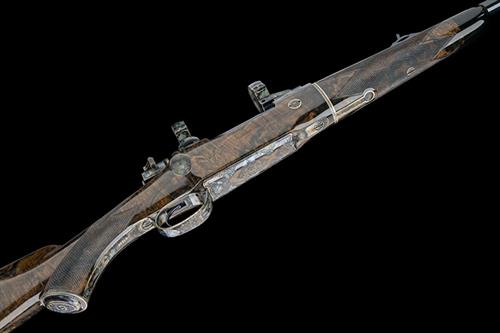 23 1/2in. nitro barrel gold-inlaid 'MANUFACTUR T. JUNG. LOHMAR', and with twin gold band details and gold-inlaid with the calibre designation at the breech end, finely matted block-mounted open sights with gold line detailing, finely matted ramp-mounted gold bead fore-sight with gold line detailing and fold-over moonsight / protector, interrupted thread take-down system, double square-bridge action with quickly-detachable telescopic sight mount bases with chequered tops and gold line bordering, colour-hardened ERA G9 Plus telescopic sight mounts, elongated top strap, colour-hardened bolt with progressive radial cut chequering and gold highlighting, engraved and colour-hardened recoil blocks with gold line border, hinged straddle floorplate with push button release, best acanthus scroll engraving overall, very highly-figured pistolgrip stock with cheekpiece, colour-hardened and engraved steel pistolgrip-cap and sling swivels, 15in. pull including 1/2in. rubber recoil pad, weight 8lb. 14oz.
