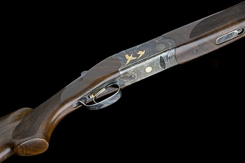 29 1/2in. nitro barrels with 6mm ventilated matt top-rib, 3in. chambers, multichokes (no spares), hold-open toplever, automatic safety with integral barrel selector switch, gold-washed trigger, beaded border and acanthus scroll engraving with gold-inlaid game scenes of duck and pheasant, retaining virtually full original colour-hardening and finish, 14 1/2in. figured pistolgrip stock (cracked at hand) including Beretta wooden buttplate, weight 7lb. 6oz.