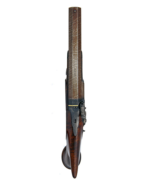 circa 1830, with browned twist-iron 6 3/4in. barrel signed 'IRVINE, gold line and scroll engraving to breech-block, moulded snail, border engraved bar-action lock with slab-sided dolphin-headed hammer, sliding safe behind the hammer, figured walnut saw-handled half-stock with chequered grip, flared heel with inset large silver oval escutcheon, set trigger with spurred guard and brass mounted mahogany ramrod