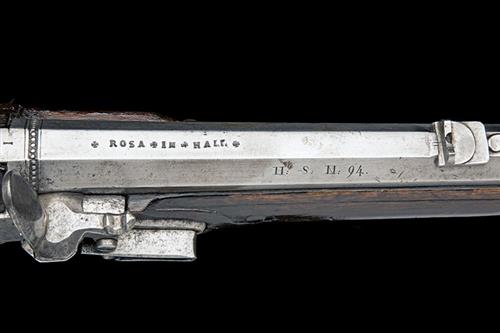 circa 1750, with brushed bright swamped 26 3/4in. barrel, the top-flat signed 'ROSA IM HALL', the right hand side-flat marked 'H: S: N: 94', dove-tailed fore-sight, standing notch rear-sight with carved foot, engraved beaded band at breech, curved flat bevel-edged lock with lozenge pan and stepped tail, bridleless frizzen, walnut full-stock with carved borders around the brass furniture, further carving to the wrist and behind the top-tang, inlaid ebony and ivory star to the raised cheek-piece, 'hogs-bristle' set trigger and probable replacement wood ramrod