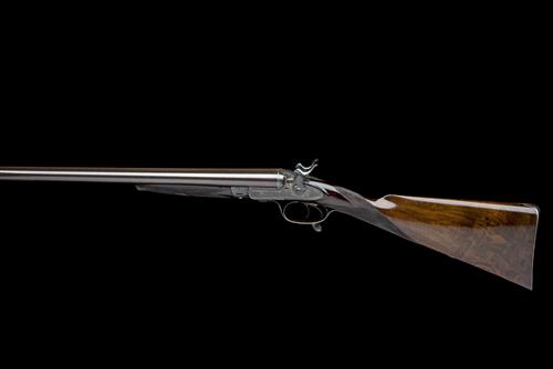 30in. nitro reproved bold damascus barrels (in 1998), rib engraved 'WILKINSON & SON. GUN MAKERS TO HER MAJESTY, PALL MALL. LONDON.' and with scrollwork at the breech ends, 2 1/2in. chambers, bored approx. true cyl. in both, wall thicknesses well below recommended minimum, action incorporating Charles Harvey patent retractable strikers, patent no. 1793 of 7th July 1866, use number 131, Jones patent rotary-underlever, non-rebounding sidelocks with carved hammers, white metal inlaid indicator lines, fine acanthus scroll engraving with feathered bordering, the standing breech engraved 'WILKINSON'S No. 131 PATENT. 1866.', 14 3/8in. well-figured stock including steel buttplate, possible repair at hand, 'Wilkinson's patent Lever Fore End' (small loss to wood at knuckle), weight 7lb. 6oz.