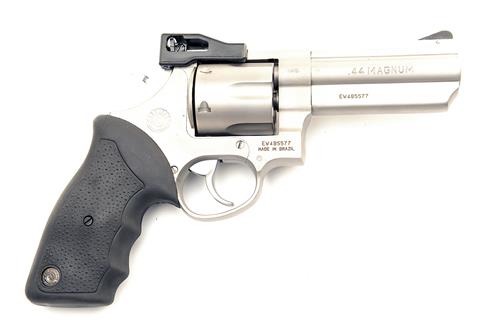 A BOXED .44 (MAG) STAINLESS-STEEL REVOLVER SIGNED TAURUS, MODEL '44 MAGNUM', serial no. 485577, with 4in. barrel , adjustable sights, swing-out fluted cylinder, satin stainless finish and soft rubber finger-grooved grip, in its maker's carton with papers, appearing unused