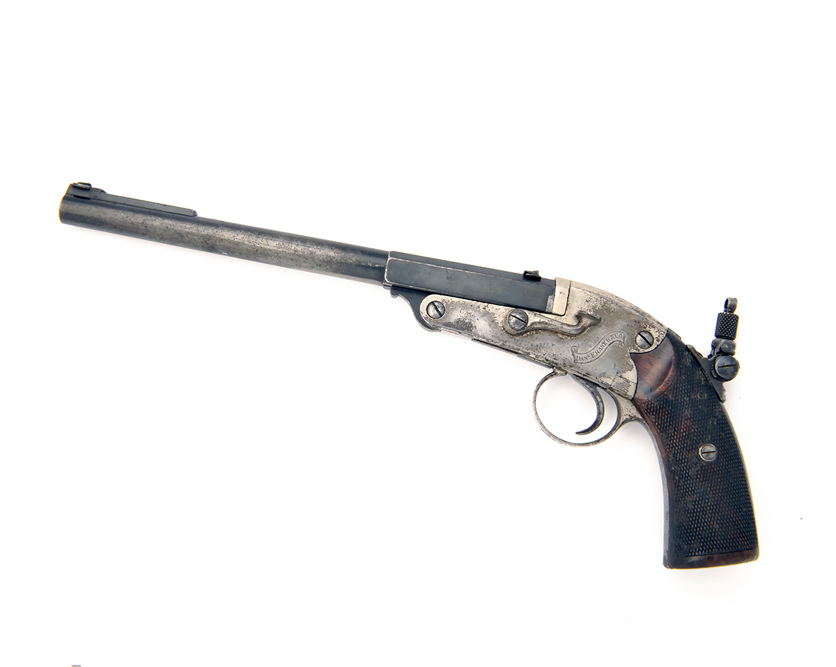 A RARE .230 (RIM) GALLERY-PISTOL SIGNED DANIEL FRAZER, EDINBURGH, serial no. 2375, probably produced on the Continent for retail, with two-stage 8 3/4in. sighted barrel, nickel-plated open hammerless frame, the back-strap with apertures for shoulder-stock (absent) and mounted with a peep-sight, chequered walnut grips and side-lever opening, strong traces of finish remaining