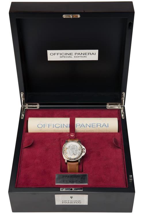 of a proposed limited edition of 100 pieces (never fulfilled), manufactured in 2007, Panerai OPIII calibre 21 jewel movement with glucydur balance-wheel, dual-tone black and silver dial with Arabic numerals at '12' & '6', luminous sword hands, magnified date window at '3', silver subdial for running seconds at '9', brushed stainless-steel cushion-shaped case with protected winder, sapphire crystal glass protected by an internal mirrored hinged stainless-steel face cover, hand engraved in Purdey's workshop with a male lion, the foliage surrounding the image accented with gold and surrounded by an engraved and gold inlaId border also signed 'PANERAI FOR PURDEYS', screw-down back with the make, model and limited edition number, fitted to a brown calfskin Panerai leather strap with signed stainless buckle and complete in its manufacturers presentation box with certificates and outer protective cartons, the whole appearing unworn