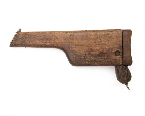 for 1900, with round tapering 5 1/2in. barrel, block and blade fore-sight, long lug-less ejector-claw, 1000m. rear-sight, large-ring hammer and old style safety, frame without milled panels, 23 groove walnut 'broomhandle' grips with lanyard ring at heel, finish worn and together with a miss-matched walnut holster stock (cracked and chipped, finish distressed)