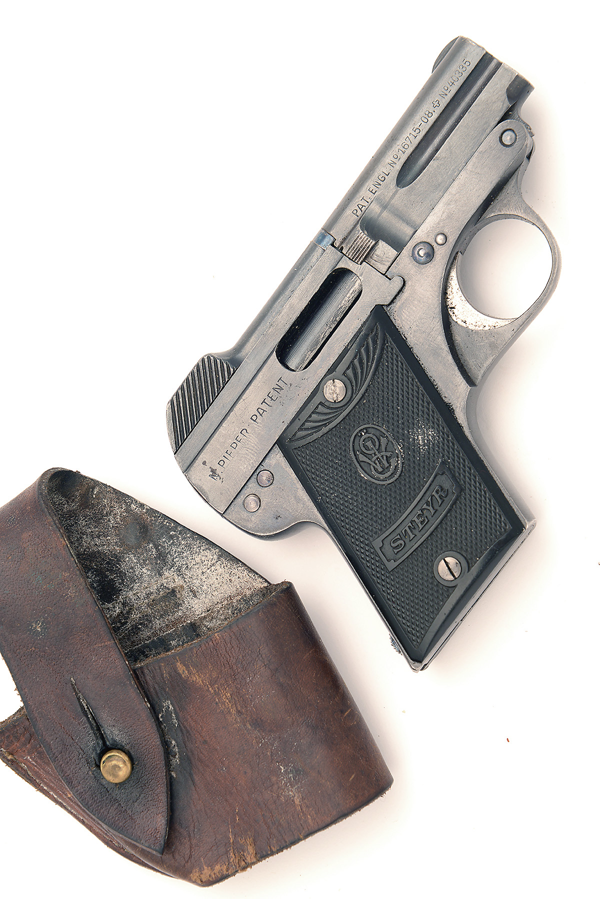 * A .25 ACP (6.35mm) SEMI-AUTOMATIC POCKET PISTOL, SIGNED STEYR, MODEL '1909 PIEPER'S PATENT', serial no. 76217A, circa 1916, with 2in. tip-up barrel, blued slide and receiver stamped 'OESTERR. WAFFENFABRIKS-GES STEYR on the left hand side and 'N. PIEPER PAT' on the right together with various world patents on the barrel, blued frame, chequered hard-rubber grip-panels with the 'Steyr' logo, detachable box magazine, the whole retaining a fair amount of original blued finish, COMPLETE WITH a period pigskin leather holster