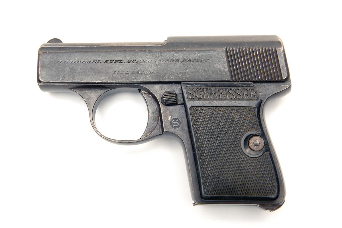 ** A 6.35mm (.25ACP) SEMI-AUTOMATIC VEST PISTOL SIGNED 'HAENEL', MODEL 'SCHMEISSER'S PATENT MODEL II', serial no. 106664 / G4488, circa 1925, with 2in. barrel, blued slide and frame and black plastic chequered grips