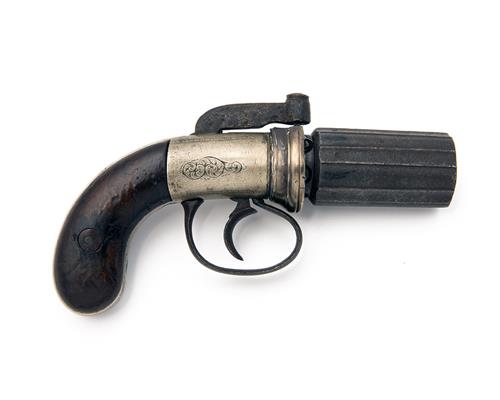 A CASED 100-BORE PERCUSSION SIX-SHOT PEPPERBOX REVOLVER, no visible serial number,