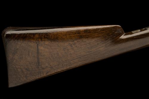 A CASED 12-BORE PERCUSSION SINGLE-BARRELLED SHOTGUN, no visible serial number,