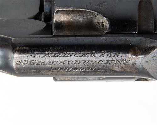 with 3in. blued sighted barrel, the top-strap signed 'J. BLANCH & SON, 29 GRACECHURCH ST LONDON', blued fluted cylinder, break-open frame, marked 'WEBLEY PATENTS W.P. 320' on one side and with the 'W&S' winged bullet trademark on the other, rocking frame mounted cylinder release locking-catch, hammerless action with safety catch to top, chequered hard-rubber grips retaining the majority of its original blued finish throughout