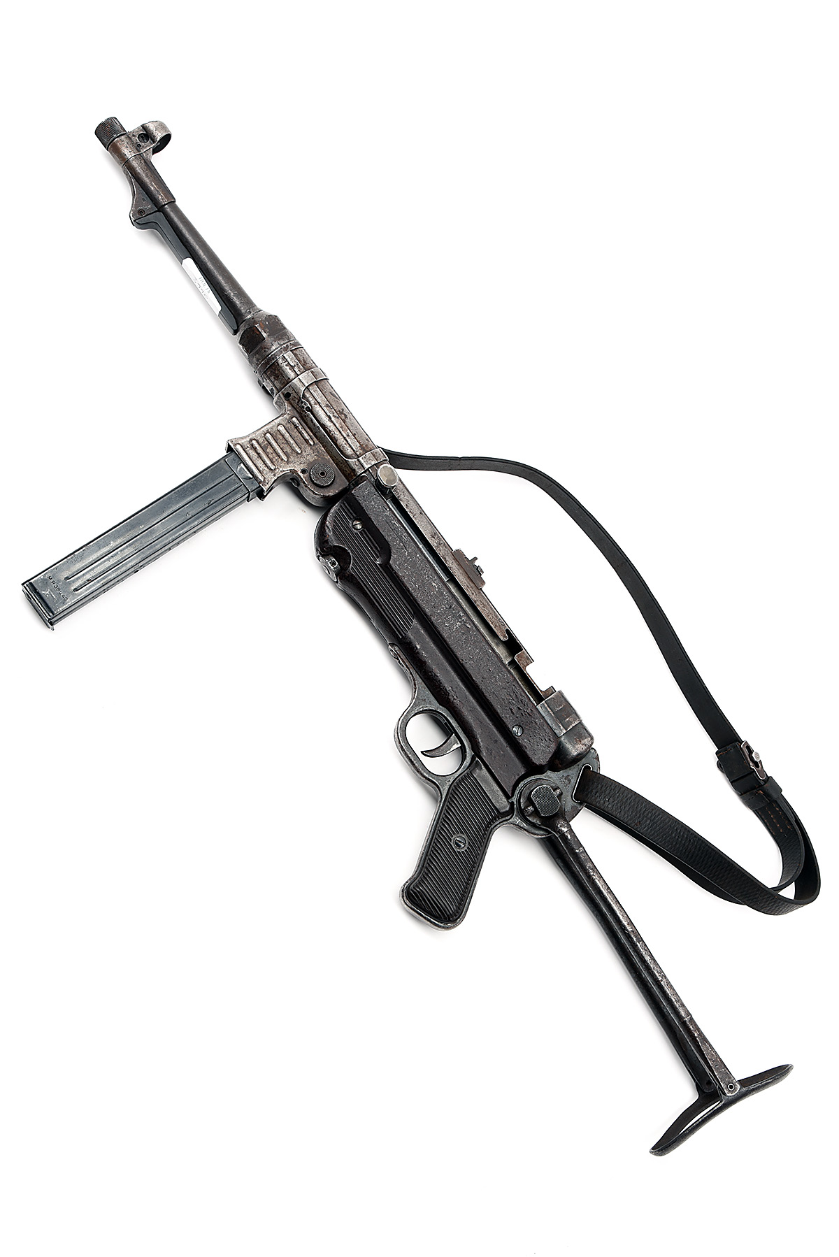 ** A 9mm (PARA) FULLY-AUTOMATIC SUB-MACHINEGUN SIGNED STEYR DAIMLER PUCH, MODEL 'MP40', serial no. 2787, dated for 1943, with 10in. tapering barrel, ramp and tunnel fore-sight, bakelite under barrel guard, pressed metal receiver, the top marked 'MP40' over 'bnz 43', folding pressed metal butt-stock, pressed metal lower receiver with ribbed bakelite pistol grip-plates and body covers, detachable box magazine, waffenampt stamps and traces of original finish, 25 1/4in. overall with stock folded