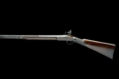 circa 1780, with 33in. triple-staged barrel, carved band at the intersection, the top-flat at breech inlaid with a gold poincon marked in raised letters 'CLEMETSHAW, ALDBOROUGH' along with 'V*P' and a crown, London proofs, floral engraving to top-strap with a sunken sighting groove, gold-lined touch-hole, slightly curved flat bevel-edged step-tailed lock signed 'CLEMETSHAW', rain-proof pan with roller-frizzen, walnut half-stock with skip-chequering to wrist, low comb with wide toe, iron furniture including pillar-fronted trigger-guard bow and two escutcheoned barrel keys, original horn-tipped ebony ramrod