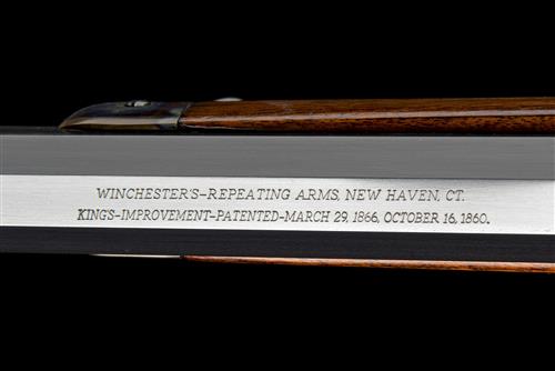 for 1877, with blued octagonal 28in. barrel, dove-tailed folding blade and ring fore-sight, elevating ladder rear-sight, the top of barrel signed 'WINCHESTER'S REPEATING ARMS CO. NEW-HAVEN CT' and 'KING'S IMPROVEMENT' with patent dates of '1866' and '1860', plain colour hardened slab-sided receiver, blued sliding dust cover and loading gate, top-tang fitted with a period adjustable ladder vernier-sight, walnut butt-stock with colour hardened iron crescent heel-plate fitted with a central sliding trapdoor containing the original cleaning rods in an aperture beneath, single set trigger, colour hardened finger-lever, plain walnut fore-end with iron nose-cap, full-length under barrel magazine, factory sling-swivels, the whole retaining the majority of its possible original factory finish and colour with only some light storage marks and appearing little used
