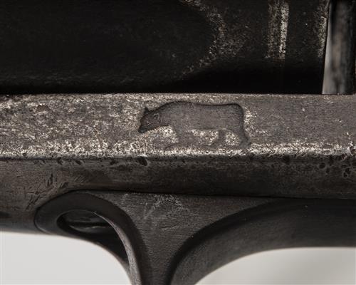 Other Notes: These scarce secondary martial revolvers were produced in numbers of around 1500 pieces. The bear stamping present on this example was traditionally associated with the California Militia but recent research has suggested that it is most probably a California retailer's stamp, name unknown