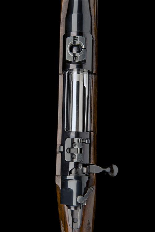 24 7/8in. nitro barrel with block-mounted adjustable folding leaf sight and ramp-mounted bead fore-sight, the receiver with quickly-detachable telescopic sight mount bases, sidewall engraved 'Medwell & Perrett SUFFOLK IP23 8AN ENGLAND', recoil blocks gold-inlaid with the MP monogram, hinged floorplate with push button release, blued finish overall, well-figured pistolgrip stock with cheekpiece, steel pistolgrip-cap, sling eyes, 14 1/4in. pull including 1/2in. rubber recoil pad, weight 8lb. 8oz.