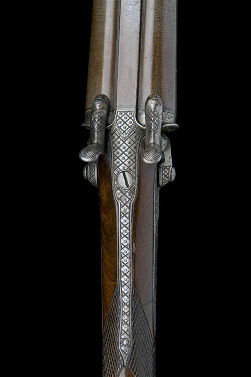 Belgian circa 1870, with laminated iron 29in. barrels, flat top-rib signed in white-metal 'M. ARENDT A LIEGE', further while metal line at breech, moulded fences to the standing breech, the action and back-action locks machine engraved with a checkerboard and dot design, the locks enhanced by bordered panels of gamescene engraving, en-suite hammers, chequered walnut butt-stock with raised cheek-piece, en-suite iron heelplate, complex trigger-guard and swing under-lever and integral iron splinter fore-end with further release lever