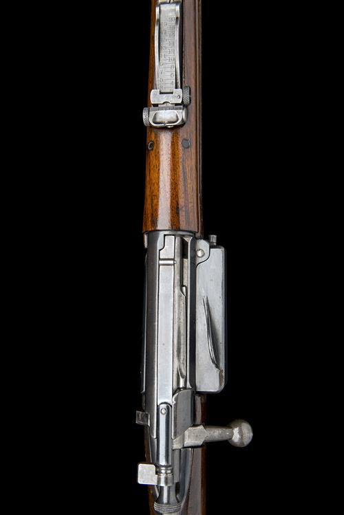circa 1899, 30in. nitro reproved barrel (in 2018) with block-mounted fore-sight, rear tangent sight, internal rotary box magazine, magazine cut-off, straight stock with some Inspector marks, blued furniture, 13 1/4in. pull including steel buttplate with trap