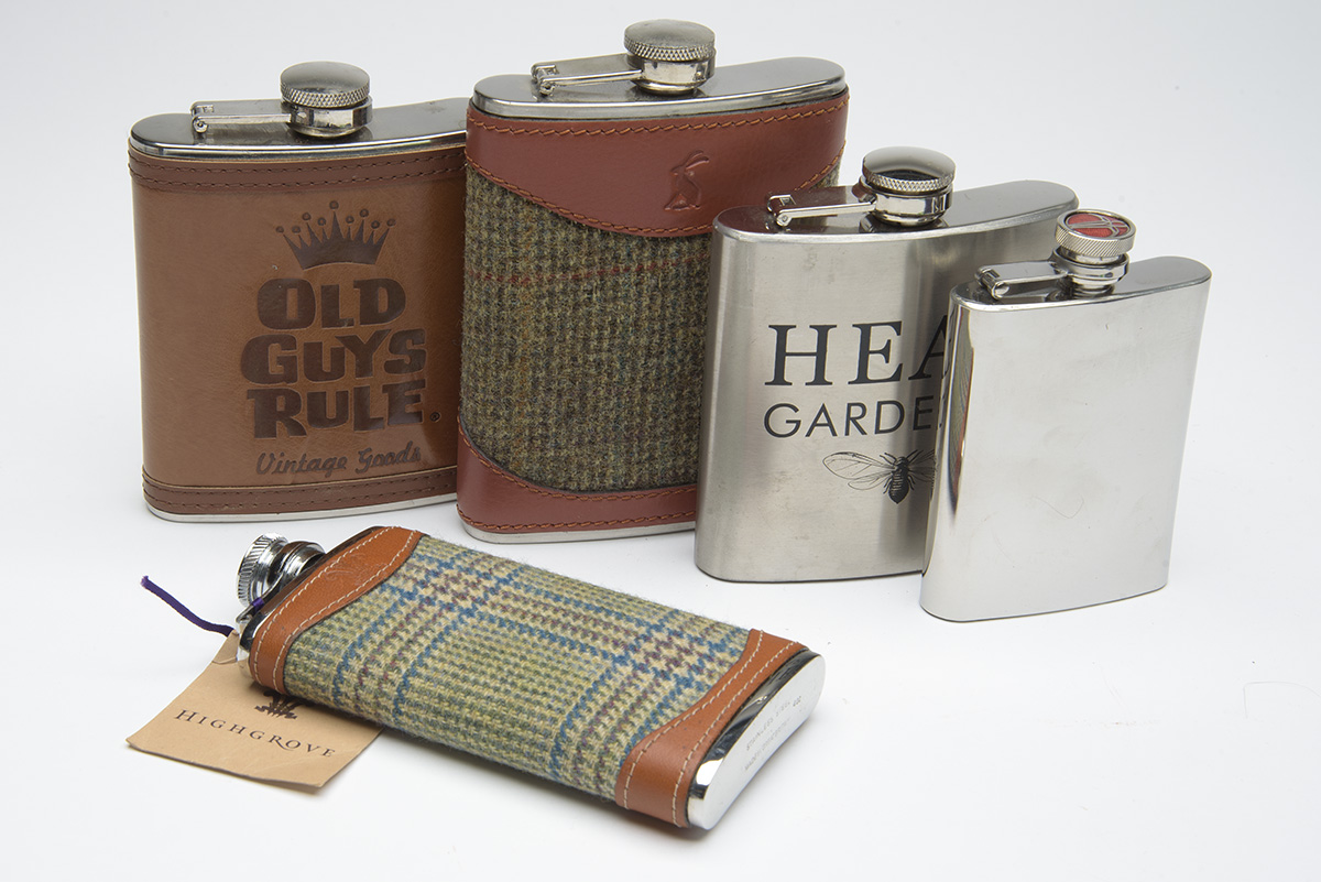 A COLLECTION OF FIVE VARIOUS DRINKING FLASKS,