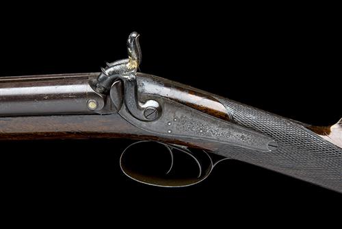 A 13-BORE PERCUSSION DOUBLE-BARRELLED SPORTING-GUN SIGNED 'GEORGE NEWTON BROWNE', no visible serial number,